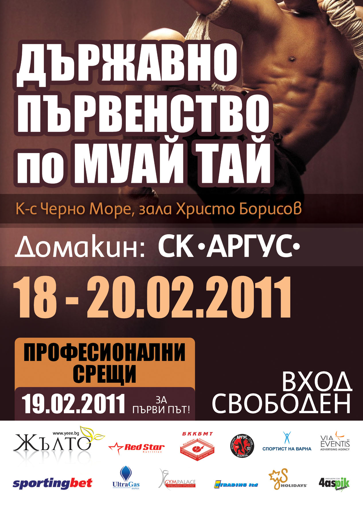 Държавното първенство по мауй тай за 2011 г. ще се проведе във Варна в периода 18 – 20 февруари. Надпреварата ще излъчи шампионите за мъже и жени, както и призьорите сред юноши и девойки старша възраст. Победителите в отделните категории ще формират състава на Националния отбор по муай тай, който ще представя България наСветовното първенство в Банкок /Тайланд/.