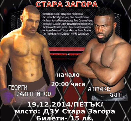 На 19 декември в гр.Стара Загора, спортна зала „ДЗУ“ ще се проведе професионален турнир по ММА – „ММА Ст.Загора“. Турнирът включва осем професионални срещи формат ММА. Основната среща на вечерта е мача между българският топ боец Георги Валентинов и французина със статистика от 8 победи и само три загуби . AYMARD GUIH.