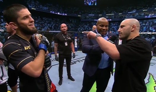 Волкановски влезе в октагона и застана лице в лице с Махачев. Двамата се разбраха да направят битка от вида шампион срещу шампион, като залогът е титлата в лека категория. Александър е шампион в категория перо и ще има шанс да стане двоен шампион.