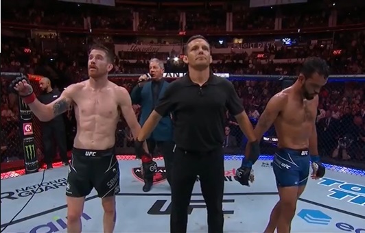 Битката стигна до решение, което беше доминантно в полза на Сандхаген - (50–45, 50–45, 50–45). С тази победа Кори записва 3-та поредна победа и сподели, че ще гледа срещата между Шон О'Мали и Алджамейн Стърлинг.