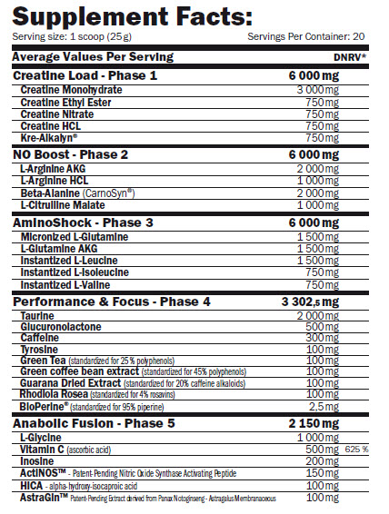 Бета аланин и креатин действат синергично за още по-добри резултати, а глутамин подпомага протеиновия синтез и предпазва мускулите от разграждане. Аргинин алфа-кетоглурат е форма на аминокиселината аргинин, но се отличава с подобрено усвояване. Тя повишава инсулиновите нива и насърчава мускулния растеж. Агматин, като прекурсор на азотен оксид, увеличава обема и плътността на мускулите, подобрява кръвообръщението и оптимизира доставката и усвояването на хранителни вещества. Кофеин и таурин действат като умерени стимуланти с цел повишаване на фокуса и концентрацията, без да натоварват нервната система.