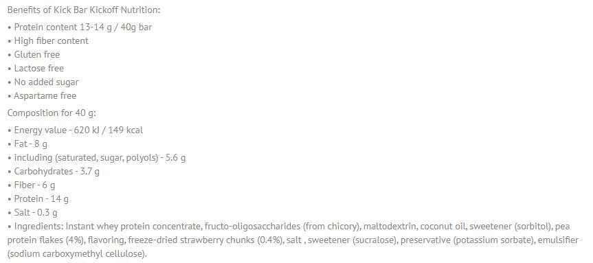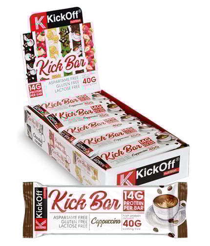 KICKOFF NUTRITION Kick Bar е невероятно вкусен протеинов бар с цели 14г. протеин и ниско съдържание на въглехидрати и без добавени захари.