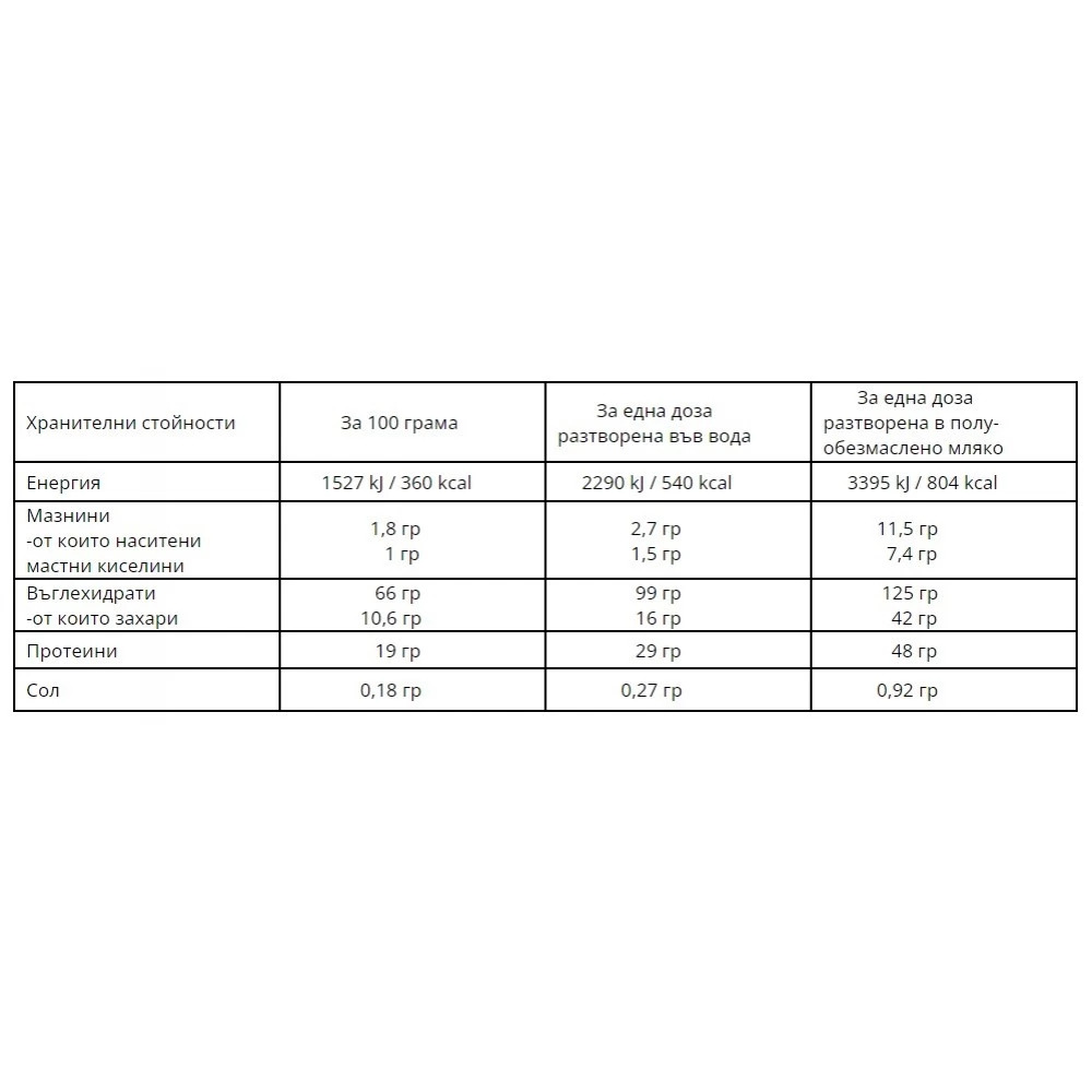 - 1 порция съдържа 49 g протеин **, 128 g въглехидрати ** и само 14 g мазнини ** => 845 kcal **