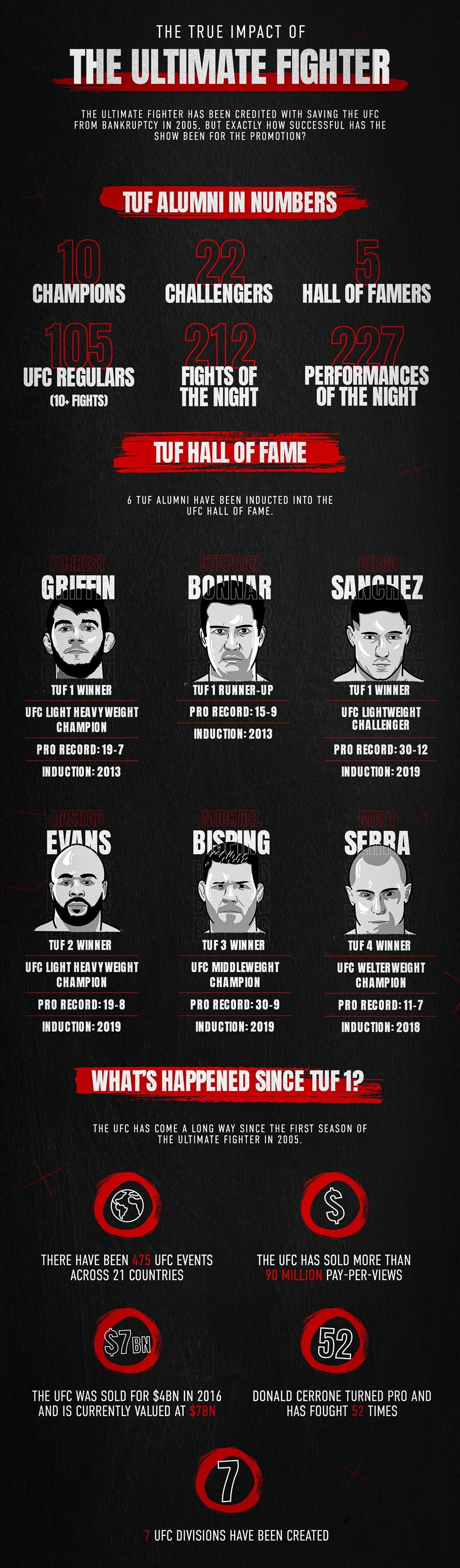 Както Betway споменава, TUF до момента има създадени цели шестима бойци-членове на т.нар. Зала на славата (Hall of Fame) и това са Sanchez, Rashad Evans, Griffin, Matt Serra, Bonnar и Michael Bisping. Влиянието на първия сезон на TUF върху развитието на UFC е известно на всички - три милиона души гледаха финала на UFC, който се проведе на 9-ти април 2005. Това беше вечерта, в която двамата победители, Diego Sanchez и Forrest Griffin завладяха публиката и станаха звезди. Битката беше приета за една от най-добрите срещи в историята на UFC, но през последните 15 години, 37 сезона по-късно, TUF е допринесло много повече за превръщането на UFC в най-популярната MMA институция.